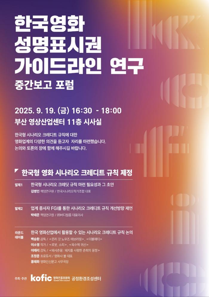 한국영화 성명표시권 가이드라인 연구 중간보고 포럼 참석으로 9월 18일 오후부터 19일까지 부산으로 외부 업무를 나갑니다.
